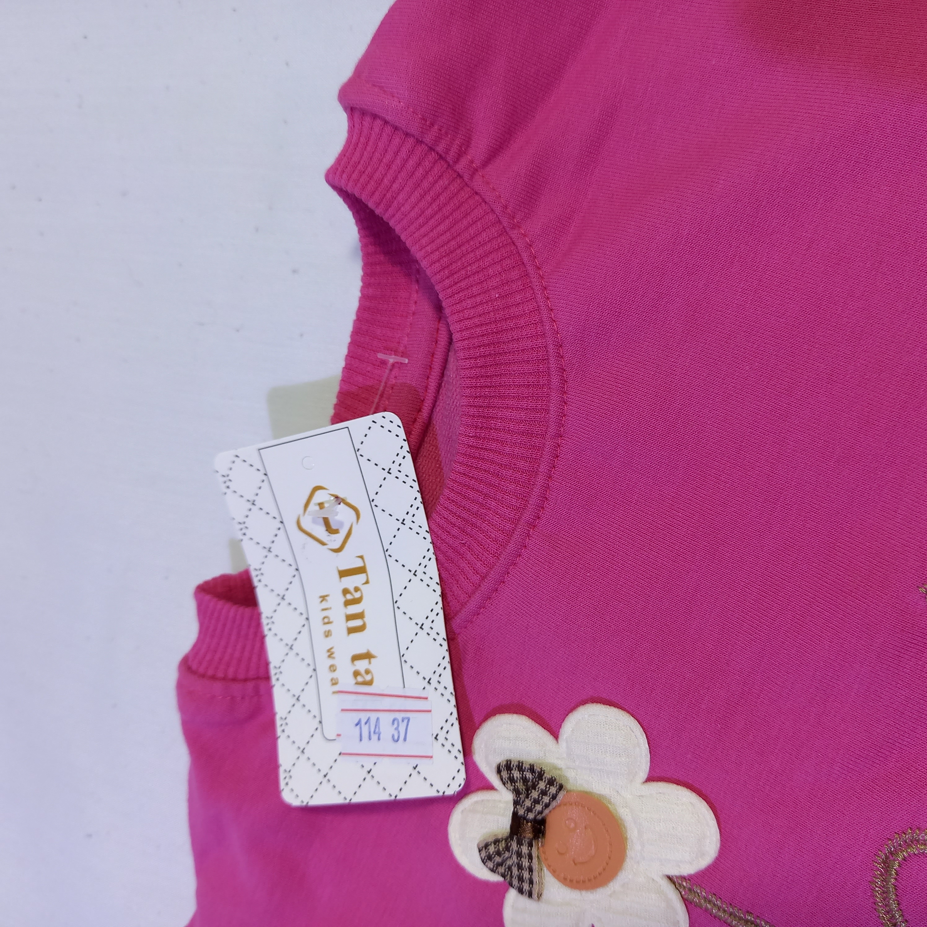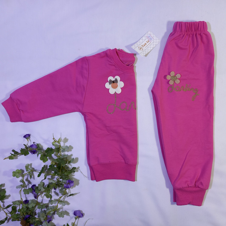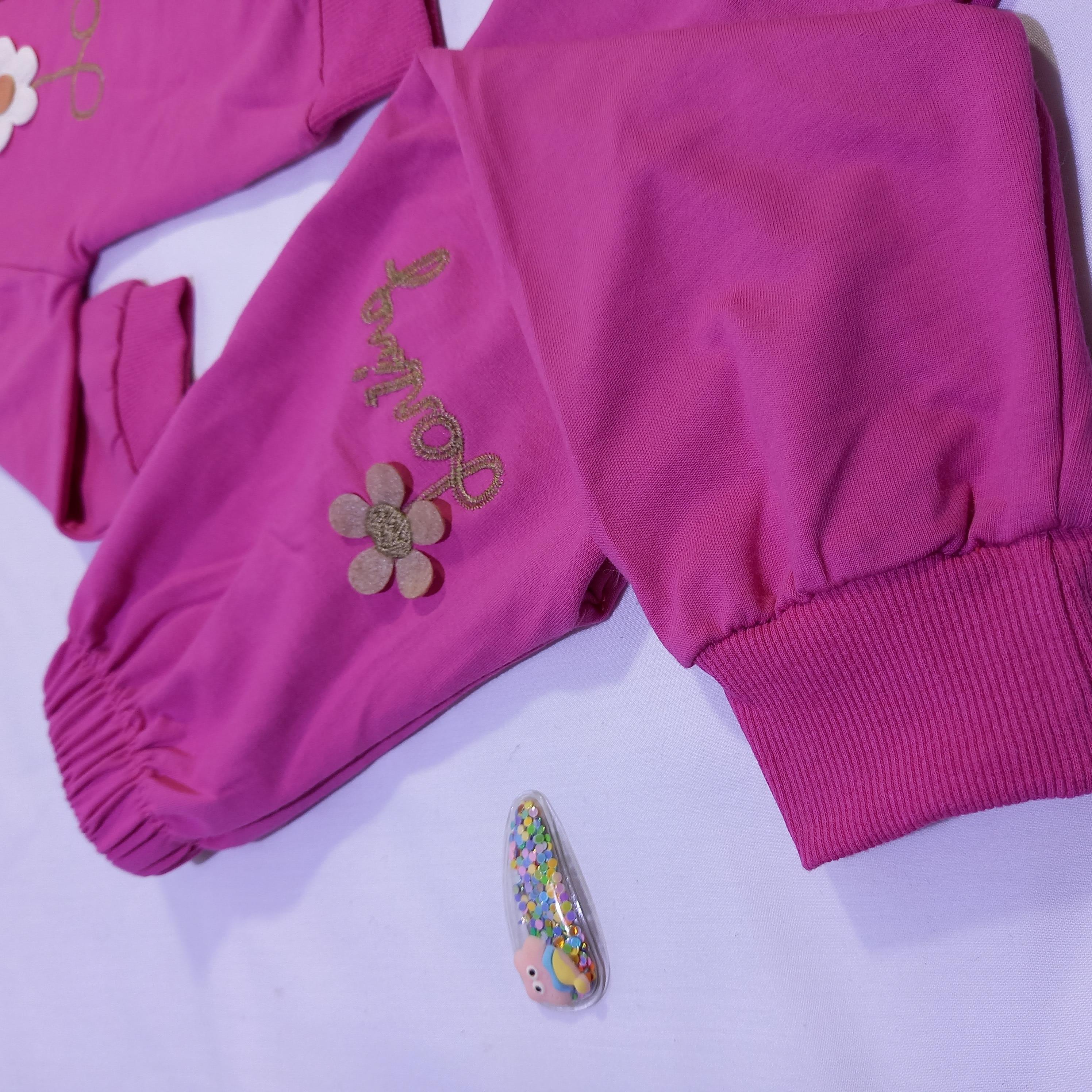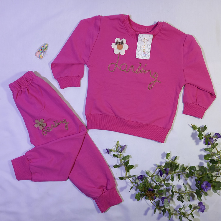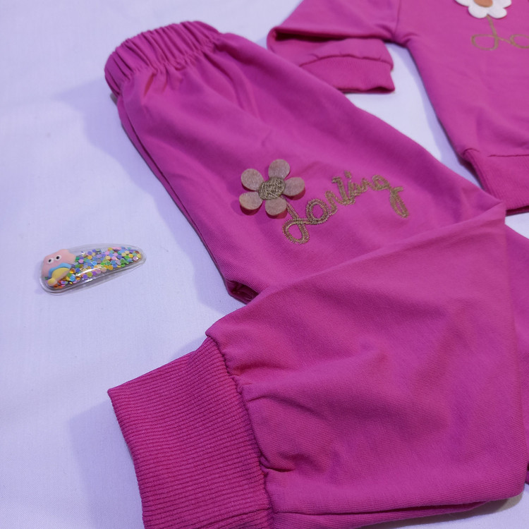ست بلوز و شلوار دخترانه پاییزه رنگ صورتی پررنگ باگلدوزی و گل برجسته جنس دورس سایز 32 و 37 کد 1018